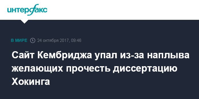 Москва. 24 октября. INTERFAX.RU - Сайт Кембриджского университета, после того как в воскресенье была в открытый доступ выложена докторская диссертация физика Стивена Хокинга, упал в понедельник из-за слишком большого наплыва желающих прочитать научную работу. Об этом сообщает газета The Guardian.