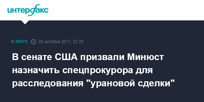 "Любой человек в министерстве юстиции, обладающий полномочиями назначить специального прокурора по сделке с Uranium One, должен сделать это, в случае если он не брал самоотвод", - написал Грассли в своем твиттере.