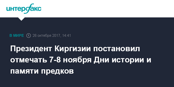 Москва. 26 октября. INTERFAX.RU - Президент Киргизии Алмазбек Атамбаев подписал указ о переименовании Дня Октябрьской революции в День истории и памяти предков, сообщили в четверг "Интерфаксу" в пресс-службе киргизского лидера.