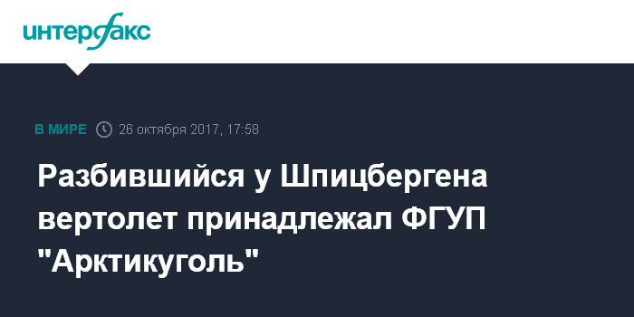 Москва. 26 октября. INTERFAX.RU - Владельцем гражданского вертолета, предположительно, разбившегося в районе Шпицбергена, является компания "Арктикуголь", сообщил "Интерфаксу" в четверг генконсул РФ на Шпицбергене Вячеслав Николаев.