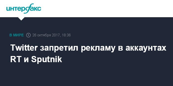 Москва. 26 октября. INTERFAX.RU - Социальная сеть Twitter запретила RT и Sputnik (иновещательный ресурс ИА "Россия сегодня") размещать рекламу в своих аккаунтах, сообщила компания в четверг в своем блоге.