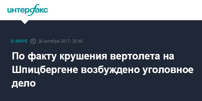 Москва. 26 октября. INTERFAX.RU - По факту крушения вертолета с россиянами на Шпицбергене возбуждено уголовное дело. Об этом сообщает в четверг пресс-служба Северо-Западного следственного управления на транспорте СКР.