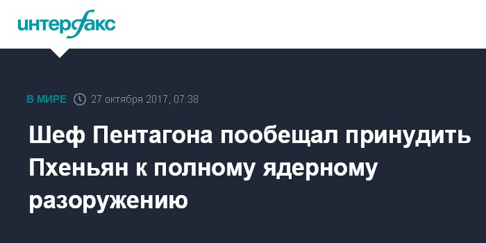Вашингтон. 27 октября. ИНТЕРФАКС - Министр обороны США Джим Мэттис заявил, что Вашингтон полон решимости заставить КНДР осуществить ядерное разоружение, сообщило агентство Associated Press. Мэттис обвинил Пхеньян в том, что его ракетно-ядерная программа "угрожает другим катастрофой" и подчеркнул, что нынешняя администрация Соединенных Штатов остается верной своим обязательствам принудить КНДР к полному ядерному разоружению.
