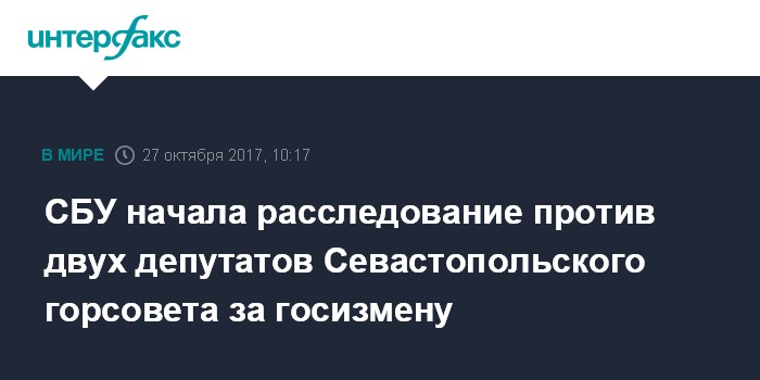 "Правоохранители собрали полную доказательную базу и установили, что двое депутатов 6 созыва, избранных на очередных выборах депутатов Верховной Рады АР Крым в 2010 году, сознательно нарушили Конституцию и другие законы Украины. Они, зная, что Севастополь является неотъемлемой частью Украины, проголосовали за "независимость" полуострова, создание так называемой "Республики Крым" и за переименование городского совета в "Законодательное собрание города Севастополь", чем нанесли ущерб суверенитету, территориальной целостности и неприкосновенности Украина", - сообщает пресс-центр СБ Украины.