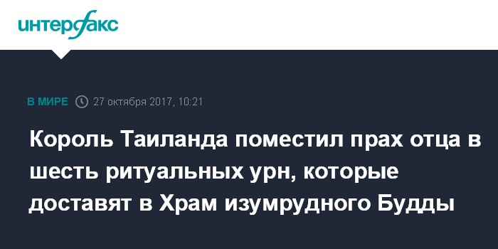 Король Таиланда поместил прах отца в шесть ритуальных урн, которые доставят в Храм изумрудного Будды
