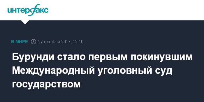 Москва. 27 октября. INTERFAX.RU - Бурунди стало первой страной, официально вышедшей из состава Международного уголовного суд (МУС), сообщает в пятницу американский телеканал Fox News.