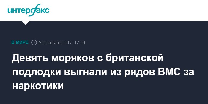 Москва. 28 октября. INTERFAX.RU - Британское военное командование в субботу подтвердило появившиеся ранее в прессе данные об исключении из рядов ВМС страны за употребление наркотиков девятерых моряков, служивших на атомной подлодке, сообщают местные СМИ.