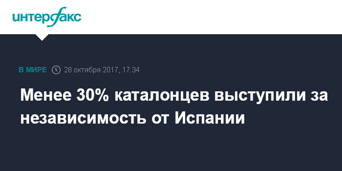 Москва. 28 октября. INTERFAX.RU - Идею независимости Каталонии от Испании в настоящее время поддерживают лишь 29% жителей этого автономного сообщества, свидетельствуют опубликованные в субботу на сайте газеты El Pais результаты опроса компании Metroscopia.