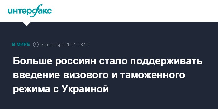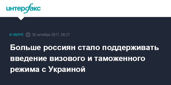 Москва. 30 октября. INTERFAX.RU - Доля россиян, выступающих за введение визового и таможенного режима с Украиной, достигла 34% по сравнению с 25% два года назад, сообщили "Интерфаксу" в "Левада-Центре".