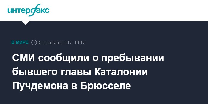 Москва. 30 октября. INTERFAX.RU - Бывший глава женералитата Каталонии Карлес Пучдемон находится в столице Бельгии Брюсселе, сообщила в понедельник испанская газета El Periódico. Еще ряд испанских СМИ сообщили, что получили от властей Испании подтверждение информации о нахождении Пучдемона на территории Бельгии.