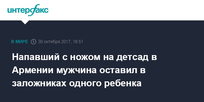 Как сообщалось ранее, неизвестный мужчина напал с ножом на детсад в городе Армавир в 48 км к западу от Еревана. В пресс-службе полиции Армении "Интерфаксу" сообщили, что получено "соответствующее сообщение, на место выехала группа".