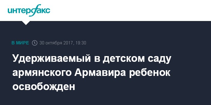 Москва. 30 октября. INTERFAX.RU - Трехлетний мальчик, который удерживался вооруженным ножом мужчиной в заложниках на территории детского сада в армянском городе Армавире, освобожден.