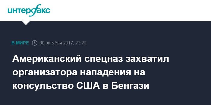 Москва. 30 октября. INTERFAX.RU - Сотрудникам сил специальных операций США удалось взять в плен ключевого организатора нападения 2012 года в Бенгази (Ливия), в результате которого погиб посол США, сообщает агентство Associated Press со ссылкой на анонимный источник.