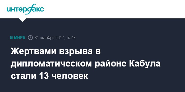Москва. 31 октября. INTERFAX.RU - В дипломатическом районе Вазир Акбар Хан в Кабуле произошел взрыв, в результате которого погибли 13 человек, передает во вторник афганский телеканал ТОЛО.