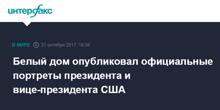 Москва. 31 октября. INTERFAX.RU - Белый дом во вторник опубликовал официальные портреты президента США Дональда Трампа и вице-президента США Майка Пенса.
