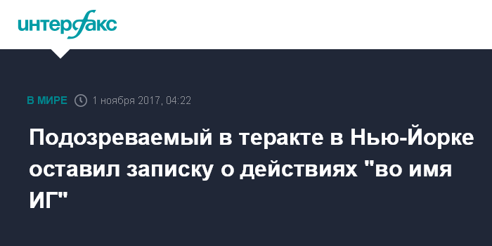 Москва. 1 ноября. INTERFAX.RU - Подозреваемый в совершении теракта в Нью-Йорке оставил в грузовике, на котором он совершил наезд на людей, записку, в которой говорится об осуществлении им атаки от лица "Исламского государства" (ИГ, запрещена в РФ), сообщил телеканалу CNN высокопоставленный представитель правоохранительных органов.
