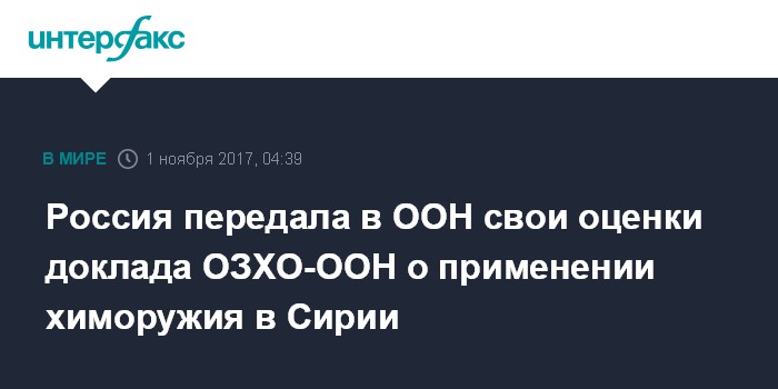 Москва. 1 ноября. INTERFAX.RU - Россия передала во вторник в ООН предварительные российские оценки последнего доклада Совместного механизма ОЗХО-ООН по расследованию случаев применения химического оружия в Сирии (СМР), сообщили "Интерфаксу" в постпредстве РФ при ООН.
