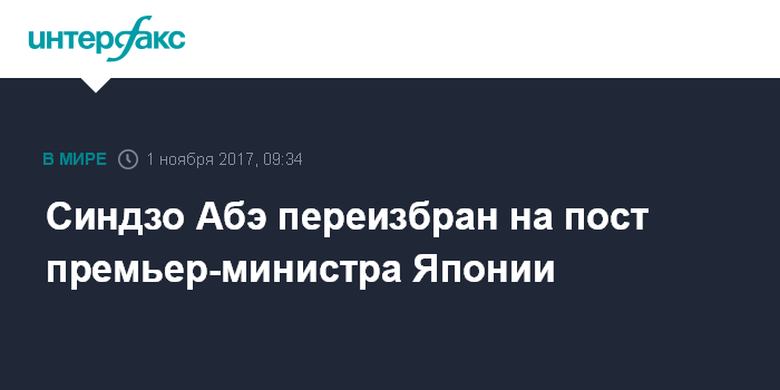 Москва. 1 ноября. INTERFAX.RU - Депутаты Палаты представителей (нижней палаты) парламента Японии переизбрали Синдзо Абэ на пост премьер-министра Японии, сообщает агентство EFE.