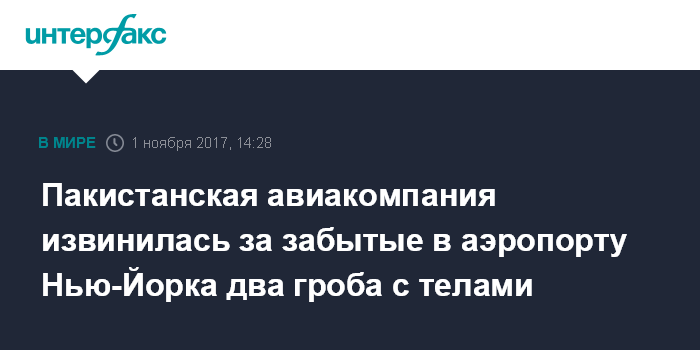 Москва. 1 ноября. INTERFAX.RU - Авиакомпания Pakistan International Airlines принесла в среду извинения после того, как сотрудники наземной службы компании забыли в аэропорту Нью-Йорка погрузить на борт тела двух человек, сообщает "Би-би-си".