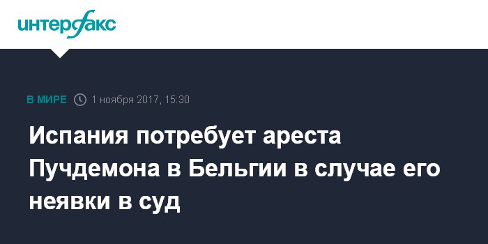 Москва. 1 ноября. INTERFAX.RU - Суд Испании направит ордер на арест отстраненного главы женералитата Каталонии Карлеса Пучдемона в бельгийские суды, если тот не явится на испанские судебные слушания по его делу, сообщает в среду газета El Pais.