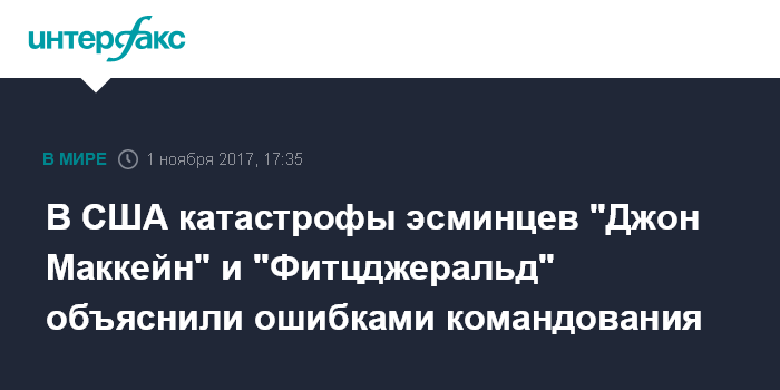 Столкновения эсминца "Фитцджеральд" с сухогрузом ACX Cristal у берегов Японии 17 июня можно было избежать, отмечается в докладе. Авария стала следствием множества мелких ошибок, которые с течением времени привели к несоблюдению практик судоходства. Наблюдатели на корабле игнорировали нормы связи, а командование судна не соблюдало протоколы для предотвращения столкновений.