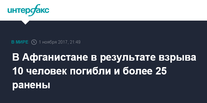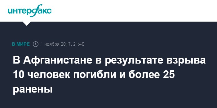 Москва. 1 ноября. INTERFAX.RU - Не менее 10 человек погибли и более 25 человек получили ранения в результате взрыва, произошедшего в городе Чарикар, административном центре центральной афганской провинции Парван, сообщают афганские СМИ со ссылкой на местные власти.