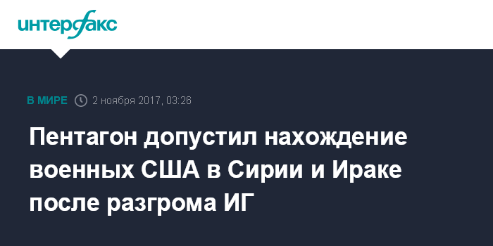 Москва. 2 ноября. INTERFAX.RU - Газета "Известия" сообщает в четверг, что Пентагон в ответ на вопрос издания не подтвердил информацию, что американские боевые части покинут Сирию и Ирак после освобождения территорий, захваченных ИГИЛ (организация запрещена в РФ).