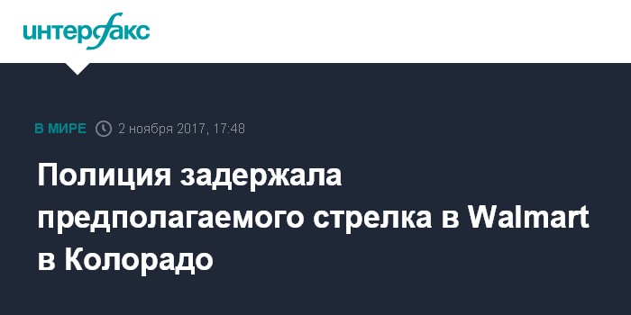 Москва. 2 ноября. INTERFAX.RU - Полиция города Торнтон в пригороде Денвера (штат Колорадо, США) сообщила о задержании подозреваемого, учинившего стрельбу в магазине Walmart. Об этом сообщает в четверг агентство Associated Press.