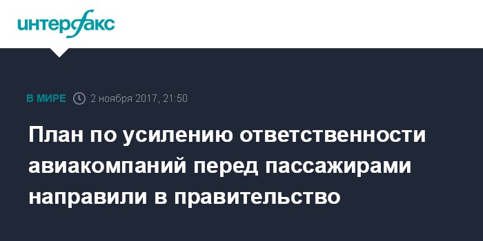 Москва. 2 ноября. INTERFAX.RU - Проект плана по усилению ответственности авиакомпаний перед пассажирами направлен в правительство, сообщили в Минтрансе РФ.