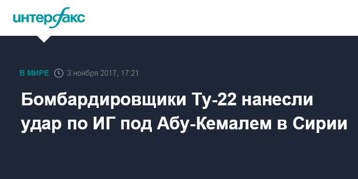 Москва. 3 ноября. INTERFAX.RU - Групповой удар шестью стратегическими бомбардировщиками Ту-22 и шестью крылатыми ракетами морского базирования "Калибр" нанесен в пятницу по инфраструктуре и боевикам ИГ (запрещена в РФ - ИФ) в районе сирийского населенного пункта Абу-Кемаль, сообщил официальный представитель Минобороны РФ генерал-майор Игорь Конашенков.