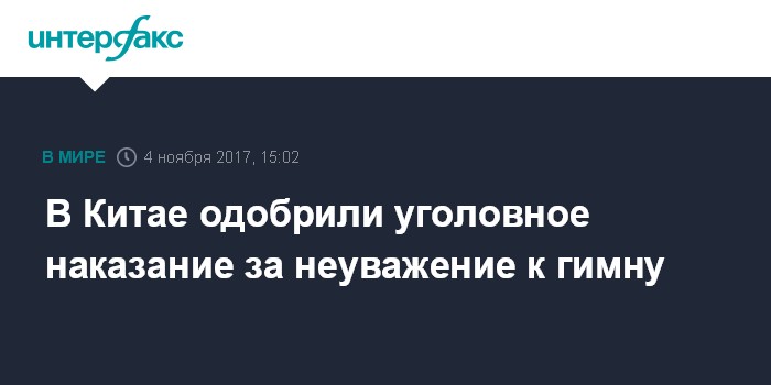 Москва. 4 ноября. INTERFAX.RU - Постоянный комитет Всекитайского собрания народных представителей (ПК ВСНП) одобрил внесение поправок в уголовное законодательство, которые предусматривают ответственность за оскорбление национального гимна, передают в субботу государственные китайские СМИ.