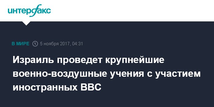 Москва. 5 ноября. INTERFAX.RU - ВВС Израиля приступают в воскресенье к проведению крупных военно-воздушных учений с участием ВВС Германии, Греции, Индии, Италии, Польши, США и Франции, сообщила пресс-служба армии страны.