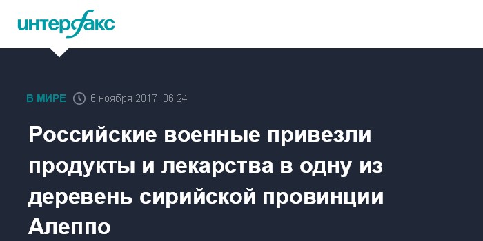 Москва. 6 ноября. INTERFAX.RU - Российские военные доставили гуманитарную помощь в деревню Джуб Мади в сирийской провинции Алеппо, где живут десятки беженцев.