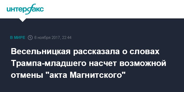Весельницкая рассказала о словах Трампа-младшего насчет возможной отмены "акта Магнитского"
