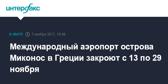 Москва. 7 ноября. INTERFAX.RU - Международный аэропорт на греческом острове Миконос будет закрыт с 13 по 29 ноября, сообщает во вторник ситуационно-кризисный центр (ДСКЦ) МИД России в твиттере.