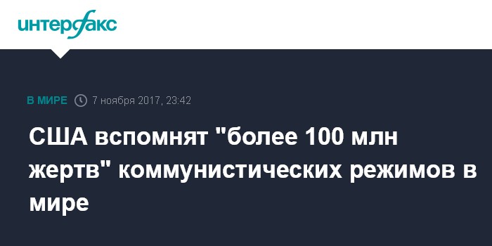 Москва. 7 ноября. INTERFAX.RU - США во вторник отмечают Национальный день в память о жертвах коммунизма и напоминают, что в мире от тоталитарных коммунистических режимов, по данным Вашингтона, погибли свыше 100 млн человек, говорится в пресс-релизе Белого дома.