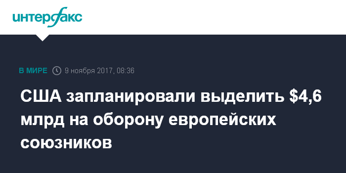 Москва. 9 ноября. INTERFAX.RU - Проектом оборонного бюджета США на 2018 финансовый год, одобренного обеими палатами американского конгресса, запланировано выделение $4,6 млрд на Европейскую инициативу сдерживания.