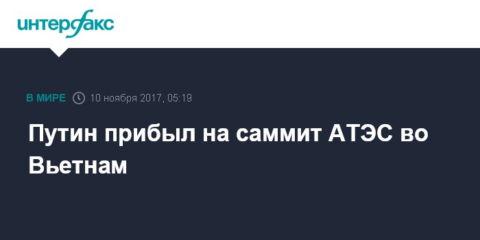 Москва. 10 ноября. INTERFAX.RU - Президент РФ Владимир Путин прибыл во Вьетнам, где примет участие в саммите стран АТЭС, а также проведёт ряд международных встреч, в том числе, как ожидается с президентом США Дональдом Трампом.