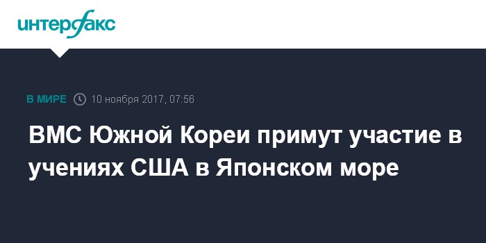 Москва. 10 ноября. INTERFAX.RU - Боевые корабли ВМС Южной Кореи присоединятся к кораблям ВМС США в ходе масштабных учений в акватории Японского моря у побережья Корейского полуострова, сообщили южнокорейские СМИ со ссылками на официальные источники.