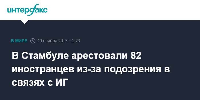 Москва. 10 ноября. INTERFAX.RU - Полиция Стамбула в ночь на пятницу арестовала не менее 82 граждан других стран, которых подозревают в связях с группировкой "Исламское государство" (ИГ, запрещена РФ), сообщает турецкая газета "Сабах".