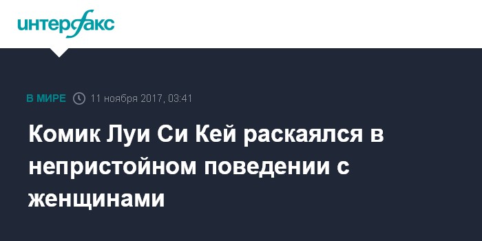 Москва. 11 ноября. INTERFAX.RU - Американский комик Луи Си Кей назвал правдивыми сообщения о том, что он непристойно вел себя в присутствии нескольких женщин и раскаялся в своих поступках, сообщает в пятницу газета The New York Times.
