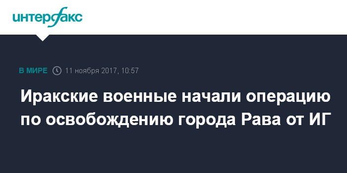 Москва. 11 ноября. INTERFAX.RU - Военнослужащие Ирака начали наступление на город Рава на западе страны, где находится оплот боевиков террористической группировки "Исламское государство" (ИГ, запрещена в РФ), сообщают в субботу западные СМИ.