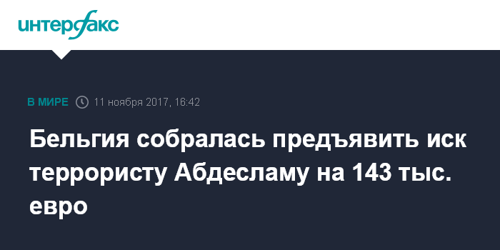 Москва. 11 ноября. INTERFAX.RU - Иск на предварительную сумму в 143 тыс. евро бельгийское государство собирается предъявить единственному оставшемуся в живых участнику терактов в Париже 13 ноября 2015 года Салаху Абдесламу, сообщил в субботу сайт RTL Info.