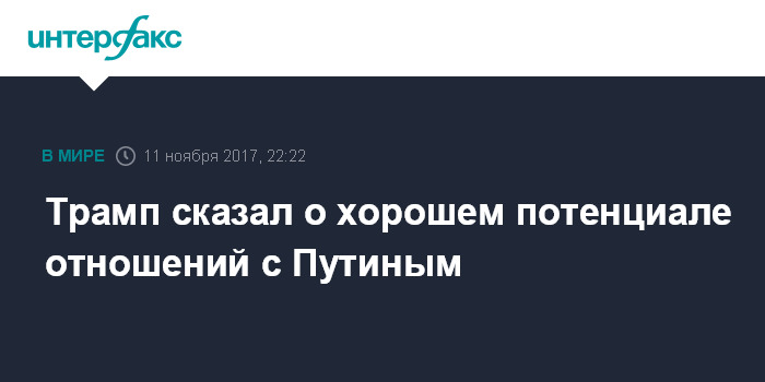 "У нас будет встреча. Я думаю, что у нас есть потенциал для очень хороших отношений. Я не знаю его так же хорошо, как президента (Китая - ИФ) Си Цзиньпина, потому что с ним я провел много времени, но думаю, что у нас есть потенциал для очень-очень хороших отношений", - сказал Трамп журналистам, отвечая на вопрос, есть ли у него планы относительно следующей встречи с Путиным.