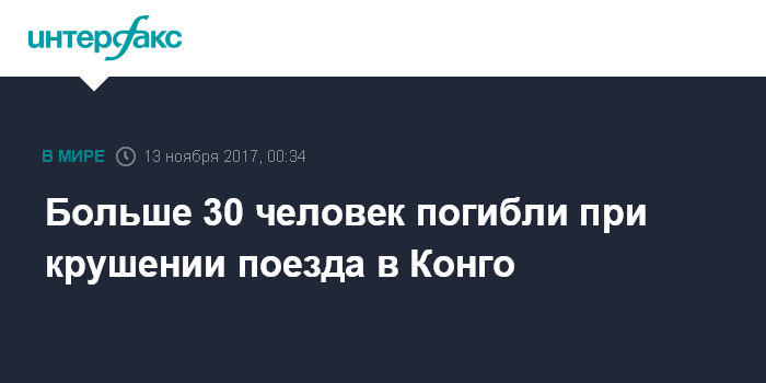 Москва. 13 ноября. INTERFAX.RU - Не менее 34 человек погибли и 26 ранены в результате крушения поезда на юго-востоке Демократической Республики Конго, сообщает в воскресенье агентство Associated Press.