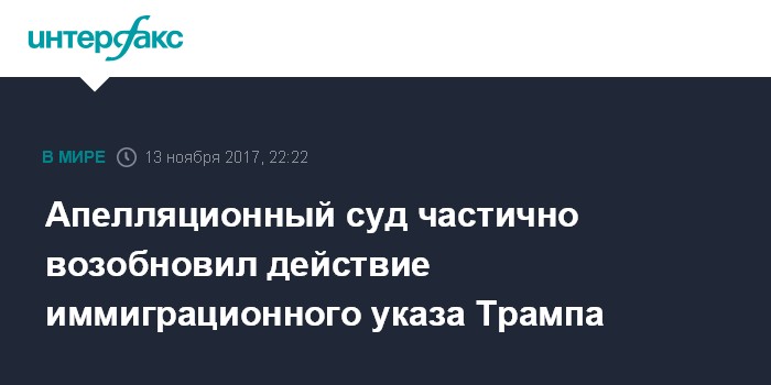 Москва. 13 ноября. INTERFAX.RU - Апелляционный суд Калифорнии принял решение, в соответствии с которым иммиграционный указ президента США Дональда Трампа может применяться лишь частично, пишет в понедельник американская газета The Washington Post. В соответствии с решением суда, граждане из перечисленных в указе стран смогут пересекать границу США только при наличии тесных родственных связей или формально подтвержденных отношений с юридическим лицом.