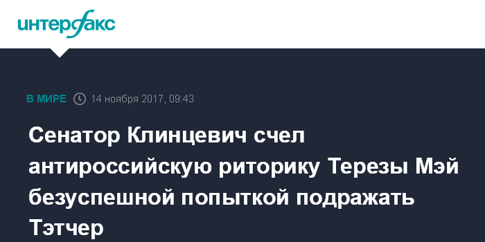 Москва. 14 ноября. INTERFAX.RU - Британский премьер Тереза Мэй, выступая с голословными обвинениями в адрес России, пытается походить на Маргарет Тэтчер, но явно недотягивает, считает первый замглавы Комитета Совета Федерации по обороне и безопасности Франц Клинцевич.