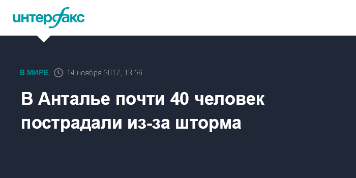 Москва. 14 ноября. INTERFAX.RU - Из-за сильного шторма в провинции Анталья, расположенной на юге Турции, 38 человек получили травмы, сообщает во вторник издание "Хюрриет".