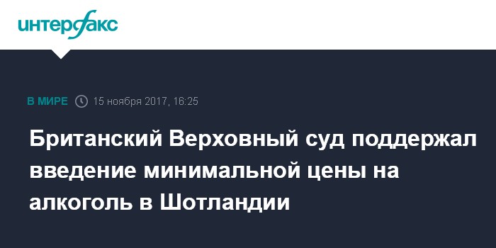 Москва. 15 ноября. INTERFAX.RU - Верховный суд Великобритании поддержал закон о введении в Шотландии минимальной цены на алкоголь, призванный бороться с пьянством, пишет в среду The Guardian.