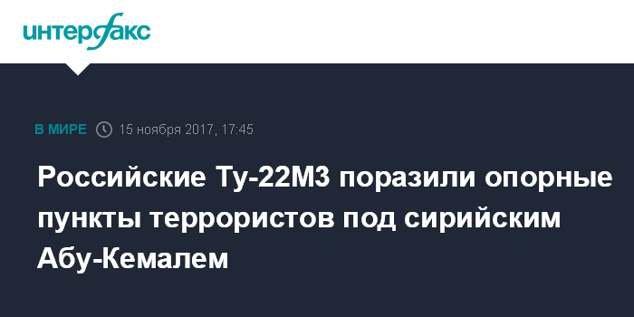 Москва. 15 ноября. INTERFAX.RU - Шесть российских дальних бомбардировщиков Ту-22М3 нанесли удар по террористам ИГ (группировка запрещена в РФ) в районе города Абу-Кемаль в сирийской провинции Дэйр-эз-Зор, сообщили в среду в министерстве обороны России.